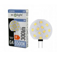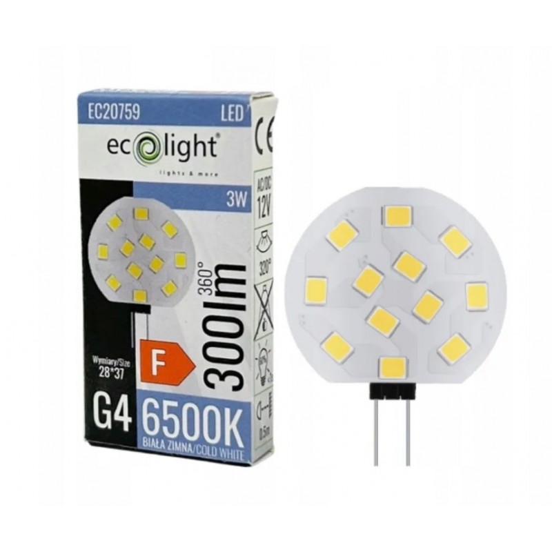 ECOLIGHT LED Bulb G4 3W 12V 6500K 300 lm (round disc type) is an energy-efficient LED light source designed for furniture lighting, decorative illumination and low-voltage 12V DC systems. It delivers warm white 6500K cold white 300 lumens brightness and a wide 360° beam angle for smooth and uniform illumination without flicker.